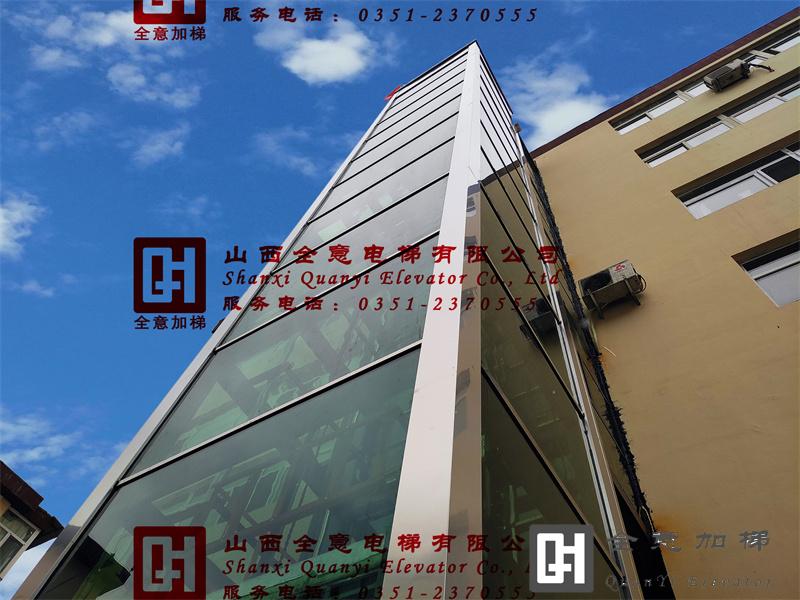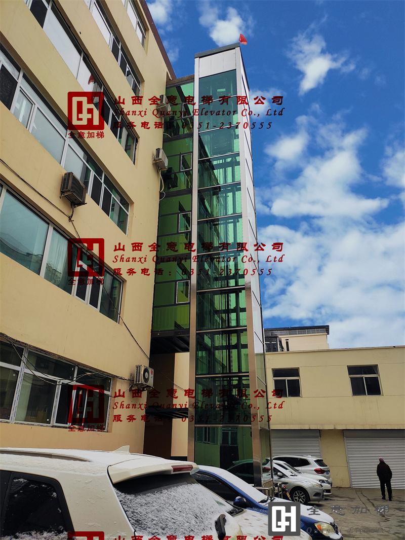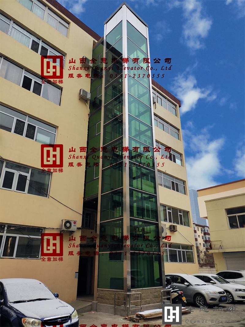 杏花嶺區東頭道巷省教委宿舍加裝電梯,采用平層入戶方式,陽臺側面開入戶門,3-6樓參與,4道連廊,連廊長度1.5米,綠色鍍膜玻璃。